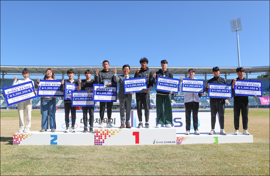 ¡Û ´ëÇÑÀ°»ó¿¬¸Í(ȸÀå À°ÇöÇ¥)Àº 17ÀÏ, Á¦104ȸ Àü±¹Ã¼À°´ëȸ À°»ó°æ±â´ëȸ ÇöÀå(¸ñÆ÷Á¾ÇÕ°æ±âÀå À°»ó°æ±âÀå)¿¡¼, ¡®µ¿¼½Äǰ(ÁÖ), SKÁõ±Ç, SKÇÏÀ̴нº, ·¹ºäÄÚÆÛ·¹À̼Ç(´ëÇ¥ÀÌ»ç Àå´ë±Ô)¡¯ÀÌ ÈÄ¿øÇϴ¡°À°»ó ²Þ³ª¹« ¿ì¼ö¼±¼ö °æ±â·Â Çâ»ó ÀåÇÐ±Ý ¼ö¿©½Ä¡±À» ½Ç½Ã, À°»ó ²Þ³ª¹« ¿ì¼ö¼±¼ö 10¸í¿¡°Ô °¢ 500¸¸¿ø¾¿ ÃÑ 5õ¸¸ ¿øÀÇ ÀåÇбÝÀ» Àü´ÞÇß´Ù.¡±°í ¹àÇû´Ù.